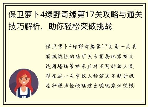 保卫萝卜4绿野奇缘第17关攻略与通关技巧解析,助你轻松突破挑战